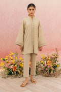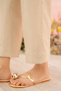 Sandstone Is A Beige Co-Ord Set. A Front-Open Shirt With A Band Collar, Pintex And Lace Detailing On The Front And Sleeves. Paired With Straight Trousers.
