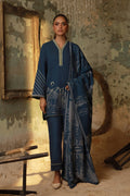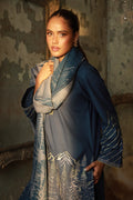 A navy blue suit featuring gradient-effect scenery embroidery on the daman and sleeves, evoking serene winter mountain landscapes. Paired with a soft grey and blue shawl, the look captures cool, alpine elegance-perfect for cozy, sophisticated winter wear.