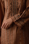 A mocha mousse-colored dress featuring striking black and white Aztec-themed embroidery, blending earthy tones with bold patterns. Paired with a matching embroidered shawl, the look exudes modern elegance with a cultural edge.