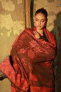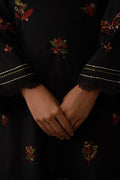 A black long shirt adorned with pomegranate-themed embroidery in rich crimson and olive accents. Paired with a rust-colored shawl featuring matching motifs, the outfit blends earthy warmth with elegant detailing.