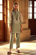 A modern cut organza short-length shirt with front embroidery, featuring an organza bow detail on the neckline and embroidered balloon sleeves, paired with raw silk culottes.