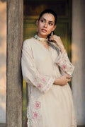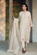 The Beige Bloom elegant 3-piece outfit features delicate floral and vine embroidery on the shirt, dupatta, and sleeves, paired with matching straight pants.