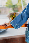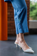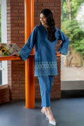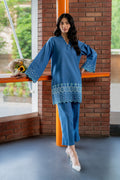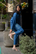 This blue co-ord set features  floral embroidery on the border, pintex details on the neckline, paired with straight pants.