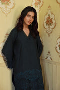 This deep green co-ord set features floral cutwork embroidery and pintex details on the shirt, paired with straight trousers.