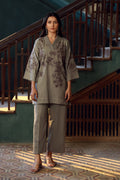 Mystic Ash is a dark grey co-ord set featuring a neckline with pintex details and floral embroidery on the front, paired with matching culottes.