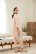 A soft pink cord set featuring a V-neckline with embroidered edging and loose sleeves finished with scalloped borders. The shirt is adorned with delicate blue floral embroidery along the hemline, paired with a tapered shalwar for an effortlessly chic and feminine look.