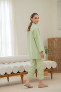 A refreshing light mint cord set featuring a button-up shirt with a spread collar, straight-cut pants, and delicate white cross-stitch embroidery for an elegant finish.