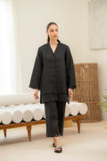 An elegant black cord set featuring a shawl collar and button-up design, styled with loose sleeves and straight-cut pants. The look is enhanced with minimal yet chic eyelet embroidery at the shirt front, while scalloped-style lace accents along the sleeve and pant borders add a refined, contemporary finish.