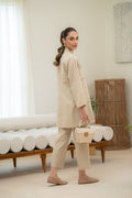 A graceful beige cord set with a mandarin neckline, pintuck-detailed placket, and loose sleeves. Featuring straight-cut pants, the shirt is adorned with box motifs and delicate floral embroidery, finished with eyelet borders and lace accents for timeless elegance.