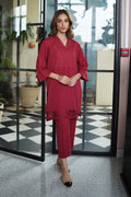 This Deep Red Co-Ord Set Features A V-Neck Kurta With Cutout Detailing And Geometric Accents, Paired With Straight-Fit Trousers For Effortless Elegance.
