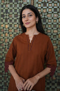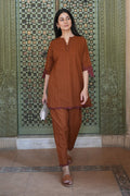 A Round V-Neckline With Fabric Manipulation And A Maroon Organza Accent, Paired With A Batwing Silhouette And Rounded Hemline. The Sleeves Feature Modern Cutwork Embroidery, With Accent Color Embroidery On The Hem, Finished With Tapered Shalwar For A Refined Look.