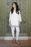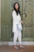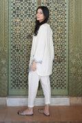 A Classic Kurta With A Y-Placket And Floral Lace Detailing, A Rounded Hemline With Embroidered Edges, And Scalloped Sleeve Embroidery, Paired With Tapered Shalwar For A Sleek, Refined Look.
