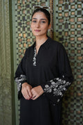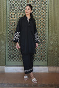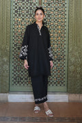 A Black Straight-Cut Kurta With A Shirt Collar, Asymmetric Embroidery On The Placket, And Flared Sleeves With White Embroidery. The Fabric-Manipulated Hemline And Embroidered Culottes.