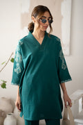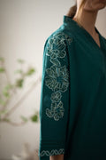 The Emerald Green Co-Ord Set Features A V-Shaped Neckline, Floral Embroidered Sleeves And Borders, Paired With Straight Trousers With A Semi-Slit Embroidered  Hem Design.