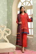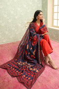 This bold 3-piece ensemble makes a statement with its deep orange base enriched with intricate ethnic-inspired Aztec motifs in navy and ochre. The shirt features detailed vertical patterns that elongate the silhouette, paired with solid red trousers for balance. The highlight is the navy-blue dupatta adorned with striking geometric and traditional motifs, adding depth and contrast