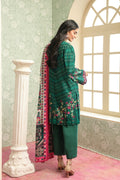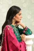 Rendered in deep emerald green, this 3-piece ensemble radiates freshness and charm. The shirt features subtle zigzag textures enriched with delicate floral sprays along the hemline and sleeves. Paired with solid green trousers for a streamlined silhouette, the look is uplifted by a contrasting printed dupatta in magenta base, showcasing intricate ethnic borders and floral accents.