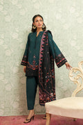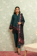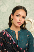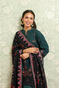 This elegant three-piece set features a straight-cut kurta paired with tapered trousers and a printed dupatta. The kurta comes in a deep teal base adorned with subtle geometric motifs and delicate detailing along the neckline, offering a refined yet contemporary appeal. The highlight of the ensemble is the black dupatta, decorated with vibrant pink, red, and purple ethnic-inspired patterns that add a striking contrast to the overall look. The trousers are kept simple and tailored.