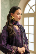 A regal 3-piece suit in rich plum-purple tones, adorned with ornate ethnic motifs in shades of ivory, maroon, and subtle teal. The shirtss straight silhouette is enhanced with detailed print placement along the neckline and borders, creating a sophisticated aura. Paired with solid trousers for balance, the ensemble is completed with a coordinating dupatta featuring dramatic borders and detailed motifs that exude grace and elegance - perfect for a refined evening look.