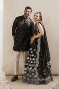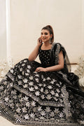 Zeba is a raven black symmetrical lehnga decked in chandi zardozi resham and gota paired with a heavily embellished black choli with sheesha work and with a black jaal net dupatta finished with kiran trims, gotta, sheesha and borders.