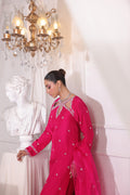 A pure Korean silk long shirt with cut work hand embellished neckline. Hand embellishments of cut daana and rhinestones are all over the neckline, front and sleeves. Paired with pure Korean silk culottes. Pure medium organza dupatta with rhinestones spray all over. Finished with pure medium silk on both the sides.