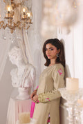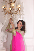 A pure 60 gms rawsilk ombre shaded olive green shirt with multi color machine embroidery on daaman and sleeves. Intricate hand embellishments on neckline , all over the front and sleeves. Kora, dabka, sequins, cut daana and rhinestones. Multi colored organza detailing on slits. Paired with pure rawsilk 60 gms capri pants. Paired with an ombre shaded hot pink dupatta. Rhinestones spray all over it.