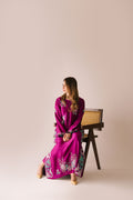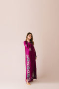 Magenta pure sheesha silk long caftan style shirt fully embroidered and appliqued with organza and threadwork. Sequins spray all over the shirt. Tassel detailing on sleeves. Paired with sheesha silk capri pants.