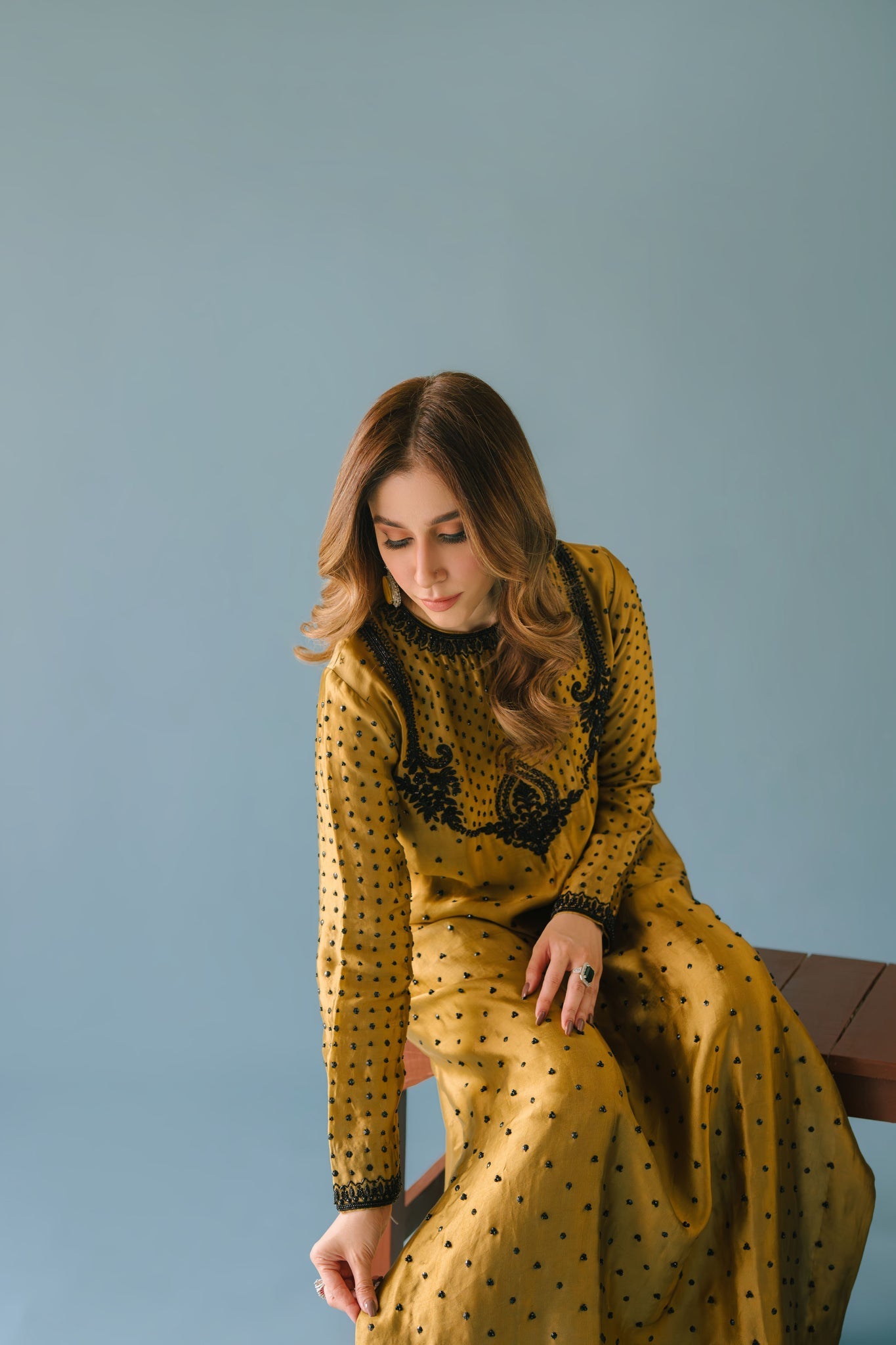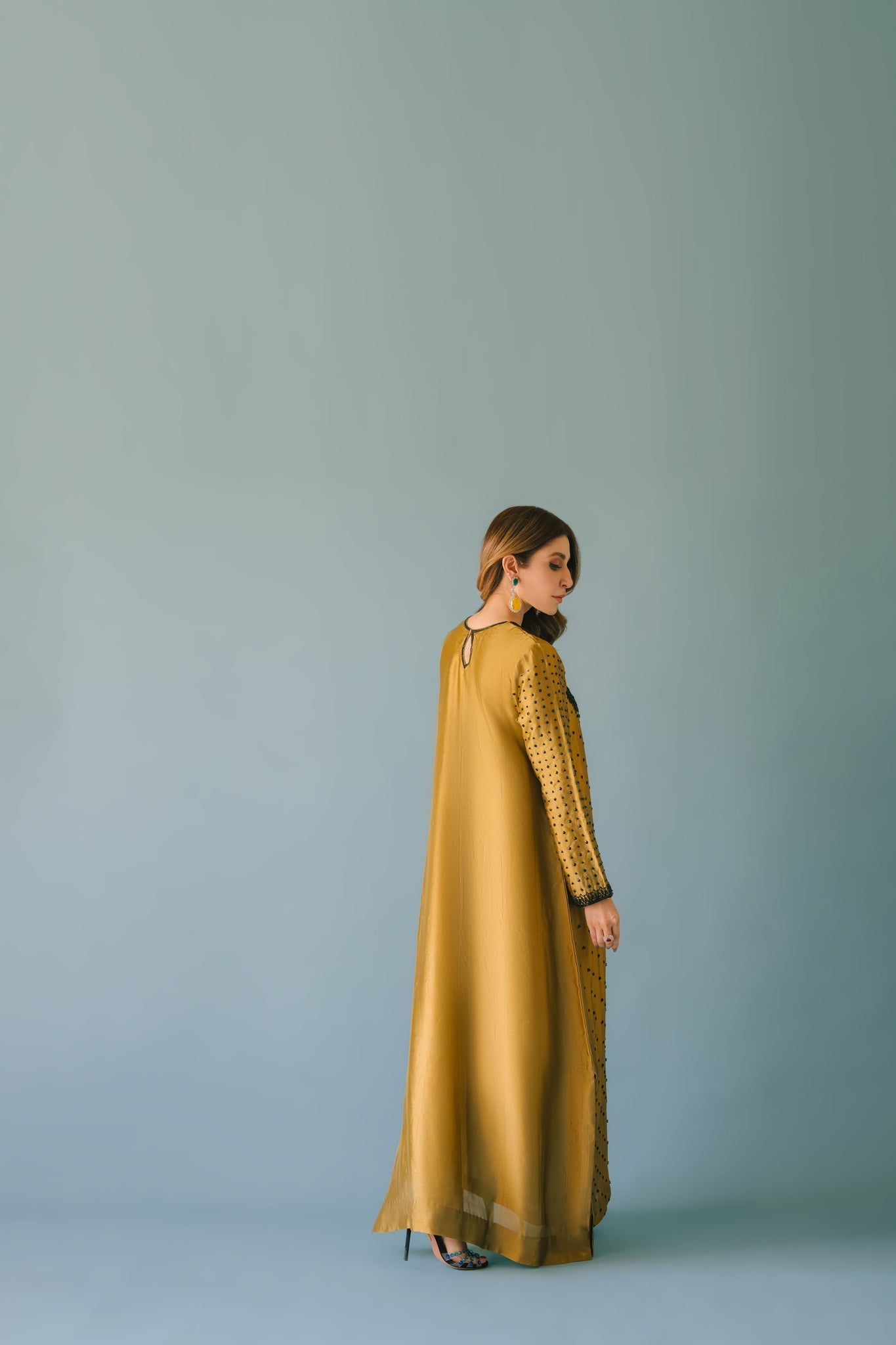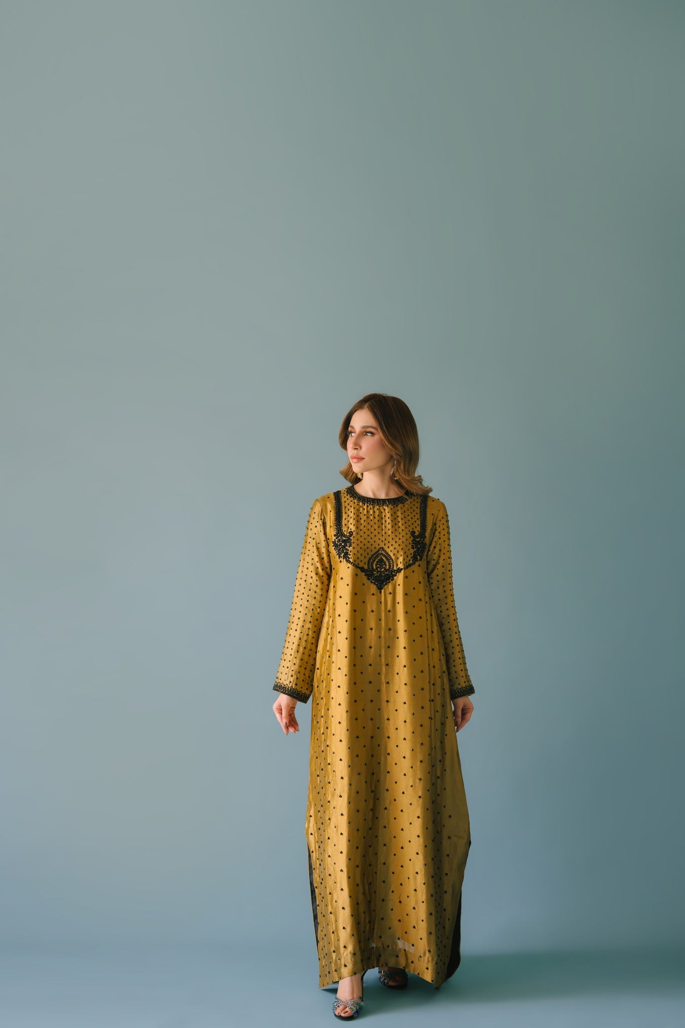 Pure sheesha silk long maxi style shirt full of hand embellishments. Cut daana, crystals, sequins, rhinestones and Kora work. We love the cut. Pure sheesha silk cigarette pants paired with it.