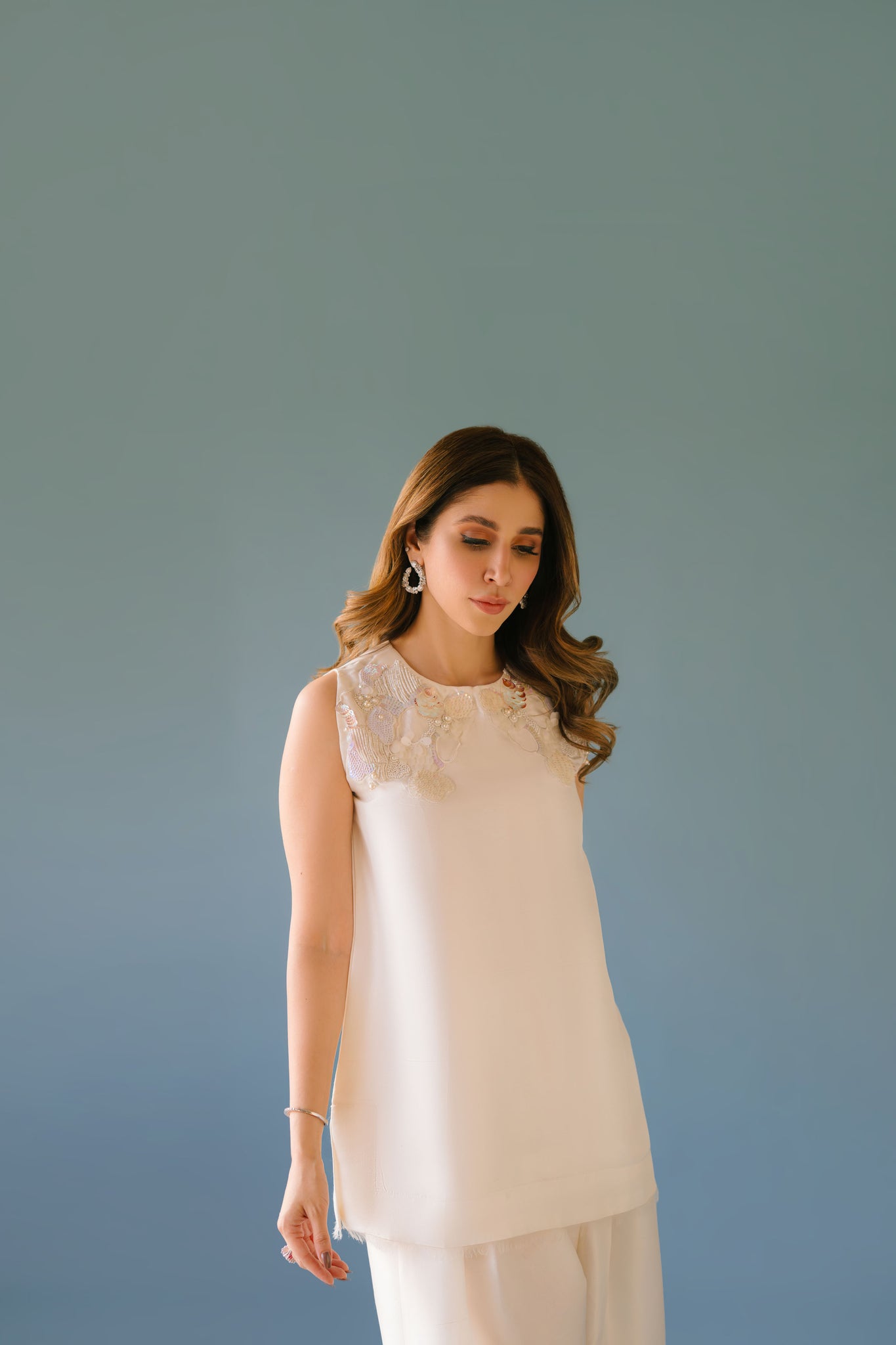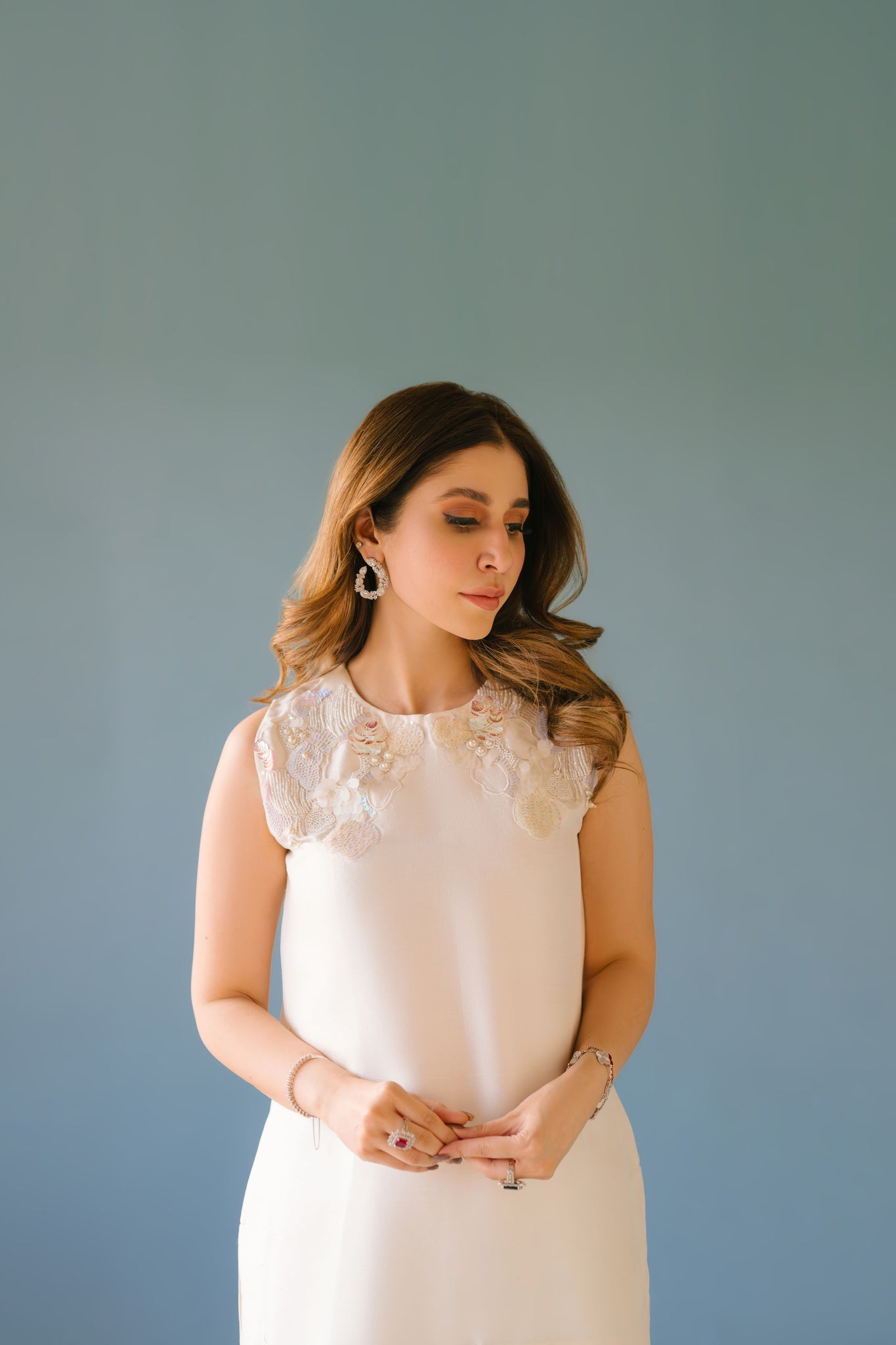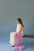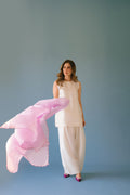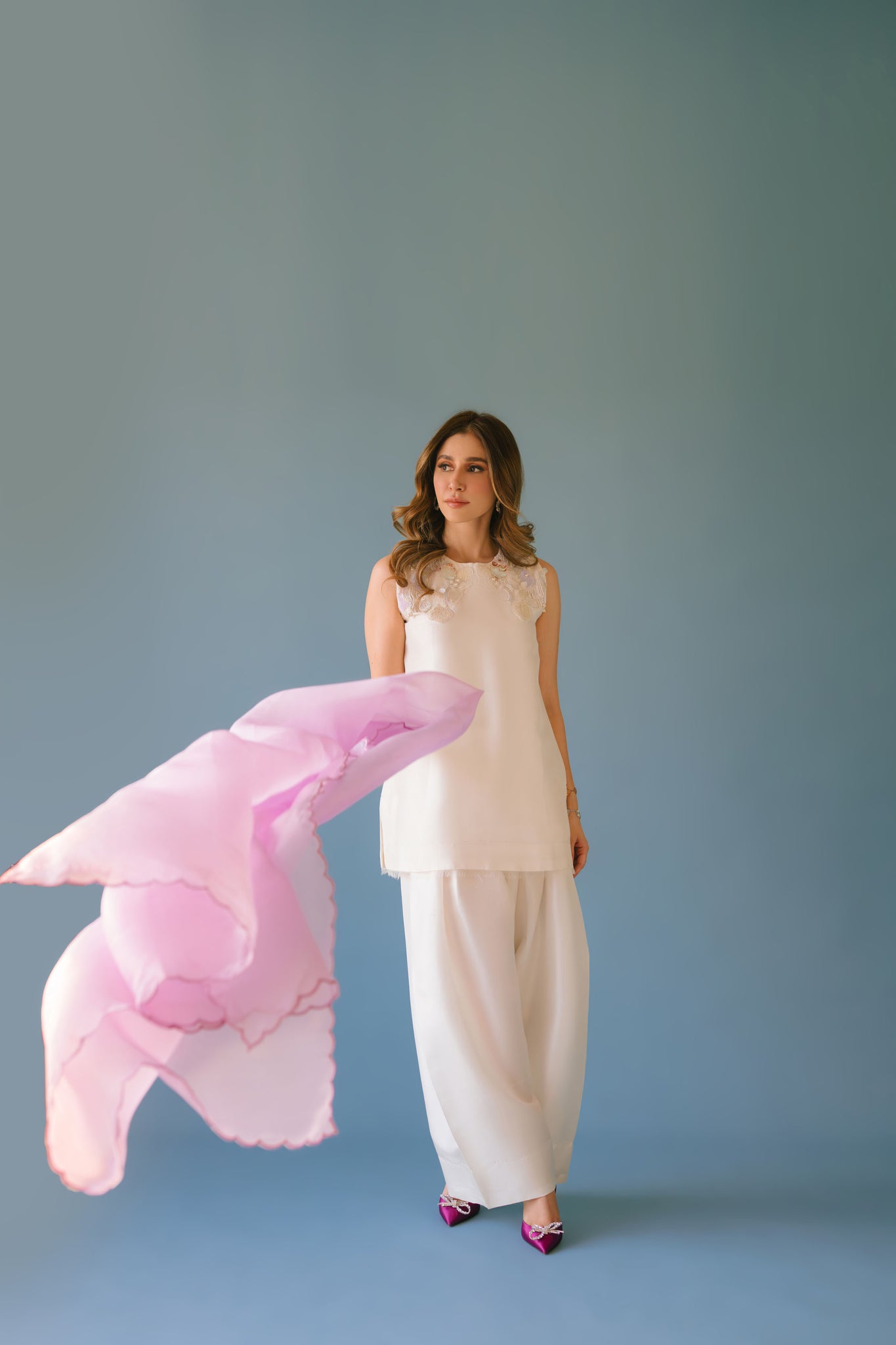 Pure rawsilk 60 gms short shirt with gorgeous three d hand embellishments with pearls, cut daana , sequins and crystals on the shoulders. Thread detailing on the hem. Paired with a pure 60 gms rawsilk farshi shalwar. Dupatta is lavender with embroidered scallops in pure medium organza.