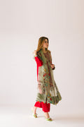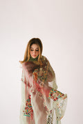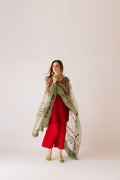 Pure sheesha silk short shirt with multi coloured embroidery and organza applique with sequins spray. Paired with pure sheesha silk short culottes. Thread detailing on daaman and culottes. Paired with a gorgeous sage green organza dupatta fully embroidered and applique work. Heavy sequins spray all over.