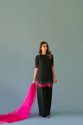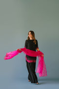A pure sheesha silk short shirt with a round hem. Hot pink applique with cut daana and rhinestones work on sleeves and daaman. Paired with a farshi shalwar of pure sheesha silk.