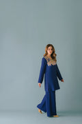 Pure Korean rawsilk shirt with hand embellishments of coin sequins and rhinestones on neckline. Paired with pure Korean rawsilk boot cut pants
