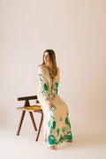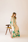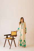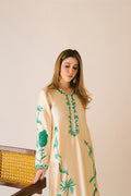 Pure sheesha silk long Maxi shirt with emerald green organza applique and embroidery work. Sequins hand embellishments all over. Finished with organza loops on slits and sleeves. Paired with pure sheesha silk capri pants.
