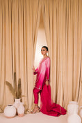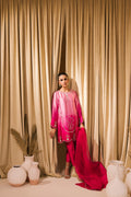 Pure sheesha silk ombre shirt with intricate hand embellishments all over. Kora, dabka, rhinestones, sequins and pearl work all over. Paired with sheesha silk skinny shalwar. Paired with pure organza dupatta with rhinestones embellishments on all 4 sides.