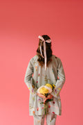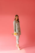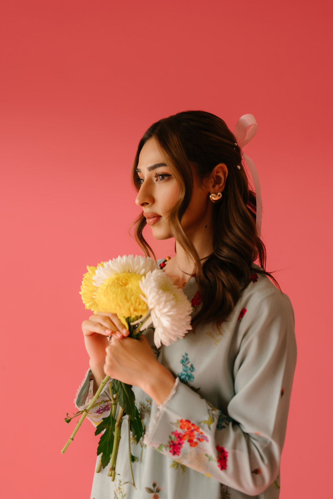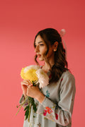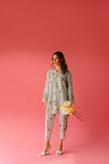 Pure khaddar digital print shirt with colorful buttons detailing on the neckline and threads detailing on sleeves. Paired with a matching digital print pure khaddar cigarette pants with box pleats and loop button detailing.