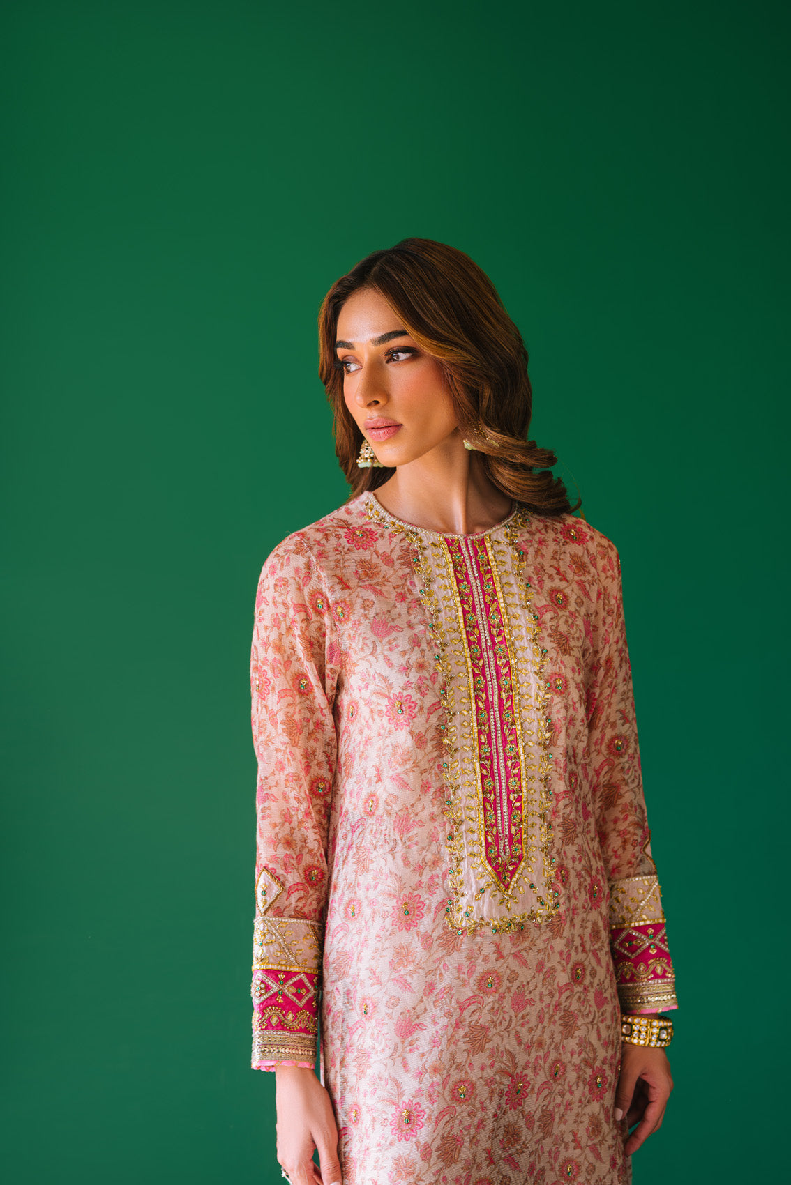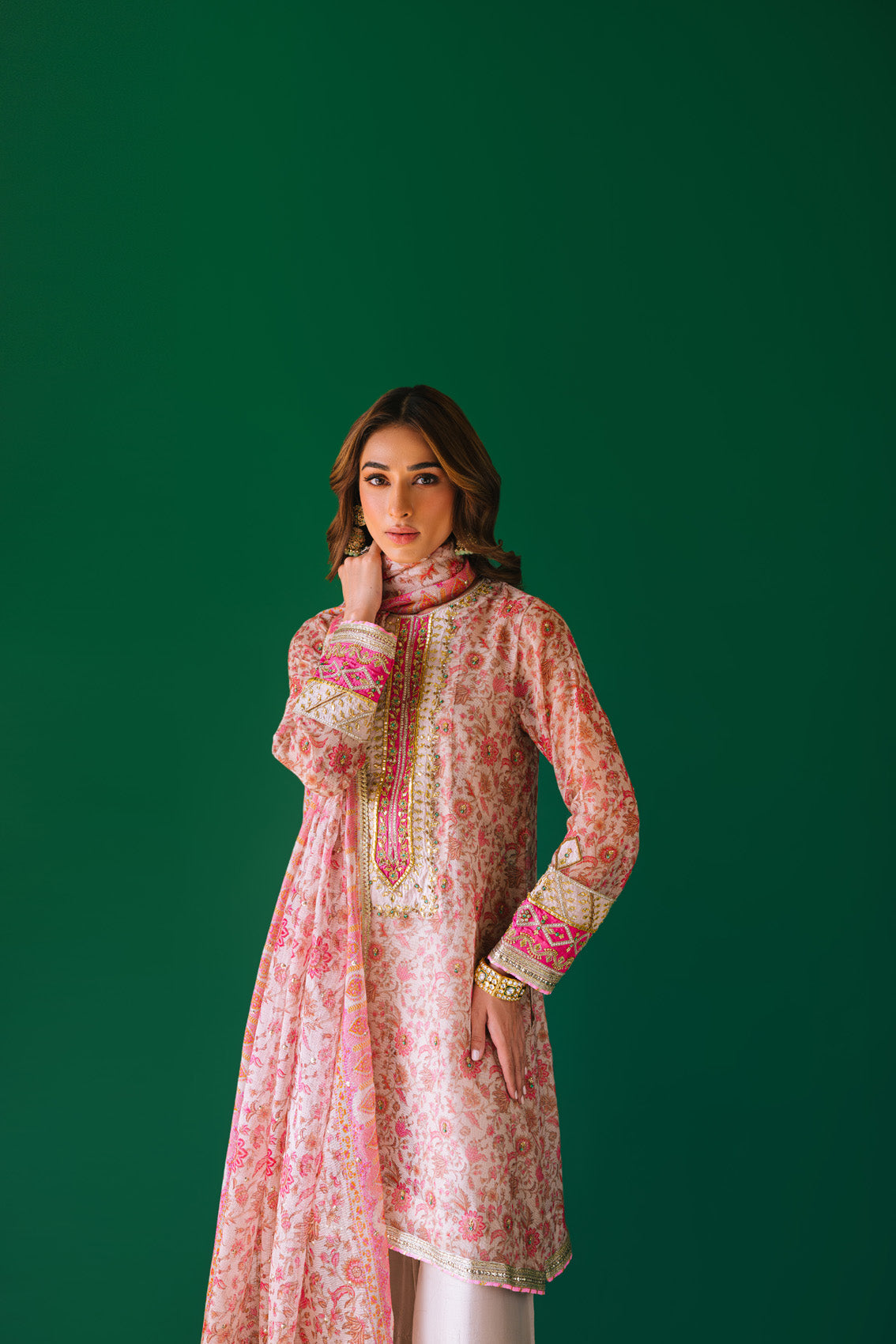 A Digital print cotton shirt with intricate and gorgeous hand embellishments on neckline and sleeves. We love the gota pati work, kora, dabka, rhinestones and pearls. Lace detailing on sleeves and daaman. Paired with pure 60 gms rawsilk culottes. Dupatta is digitally printed cotton net with sequins spray all over and lace detailing.