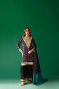 A pure charmeuse silk screen printed shirt with heavy and intricate hand embellishments. Gota work, kora, dabka, rhinestones, pearls and zari. Finished with pure emerald green rawsilk and gota laces. Paired with a Korean rawsilk gota lace finished shalwar. Dupatta is pure medium silk ombre dyed done with gota lace finishing.
