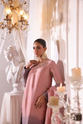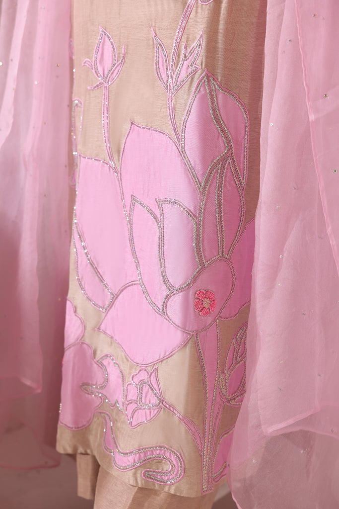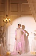 An ivory long pure tassel silk shirt with stunning pink applique work on daaman and sleeves. Hand embellishments on daaman and sleeves. Cut daana, rhinestones and sequins. Gorgeous hand work on neckline and sleeves as well. Paired with tassel silk culottes. A powder pink pure medium organza dupatta with rhinestones spray all over.