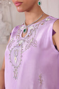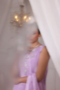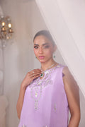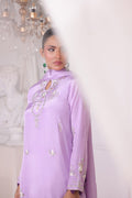 A pure tassel silk lavender short shirt with gorgeous embellishments on neckline, sleeves and front. Kora, dabka, reshamwork, rhinestones and sequins work. Finished with purple organza detailing on daaman and sleeves. Paired with a pure tassel silk khuli shalwar. Dupatta is pure medium silk with sequins spray all over and finished with purple organza tassels on both sides.