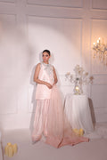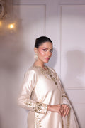 A pure sheesha silk ivory short shirt with antique hand embellishments on neckline, sleeves and daaman. Kora, dabka, sequins, gota and rhinestones. Paired with cotton silk gharara pants. Dupatta is pure medium organza with interesting patterned rhinestones and sequins embellishments on both the palloo. Finished with antique kiran on all four sides.