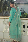 Aqua Green silk shirt embellished on the front and sleeves. It can be paired with silk worked izaar and maisuri dupatta.