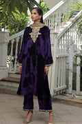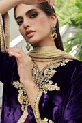 Deep Purple, pure velvet shirt with heavily embellished neckline and detailed sleeves. It can be paired with an embellished culottes and gold, crushed dupatta embellished with lace borders and tassels.