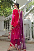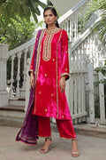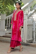 Hotpink, pure velvet shirt with heavily embellished neckline, front and sleeves. It can be paired with an embellished culotte and purple, sheer net, embellished dupatta.