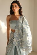 Exuding celestial elegance, this ice-blue ensemble pairs a structured charmeuse tube top with a diaphanous, fully embroidered organza jacket. Rendered in a whispering frost hue, the jacket is adorned with intricate zardoze work, delicate scalloped edges, and luminous floral embellishments. Paired with a matching pre-draped waterfall skirt, crafted from lustrous charmeuse, creating a seamless blend of structure and fluidity.