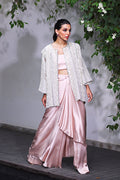 Reminiscent of a romantic escape, a statement lace jacket in an ethereal ivory hue drapes over a blush pink charmeuse tube top and waterfall skirt. Silver stones and pearls are meticulously embroidered along the lace panels, illuminating the oversized jacket with its theatrical, flared sleeves.