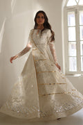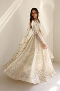 Radiating luxury in a soft ivory hue, a french tulle and khaddi silk peshwas is a vision of timeless glamour. The flared silhouette is adorned with intricate resham floral embroidery and gold sequin detailing. Zardoze embellishment elevates the keyhole neckline and back, enhancing the regal allure. Paired with a pre draped french tulle dupatta featuring floral and sequin details.