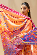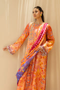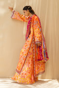 This three piece set unfolds on a tangerine canvas, alive with vivid florals reminiscent of a painted garden. An A line cotton net kurta flows with ivory scalloped accents, a dramatic side slit and an embroidered neckline, while scalloped cuffs frame the sleeves. Wide palazzos in matching cotton net echo the motif in quiet harmony. A fluid medium silk dupatta, shaded in ombre tones and scattered with jewel toned vines and blossoms, completes the look in a symphony of colour and craft