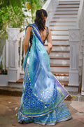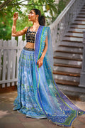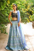 In serene shades of sky and aqua, this ensemble strikes a balance of artistry and finesse. The ebony velvet cropped blouse is richly embroidered with gilded vines and florals, its dark surface shimmering against the light. It is paired with a flowing pure rawsilk lehenga in layered tones of blue, adorned with fine gota embroidery, delicate sequins and painterly florals that scatter across its expanse. A diaphanous organza dupatta, edged with gota and finished with tasselled accents, completes the look with refined elegance.