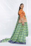 n vibrant tangerine, this sleeveless peplum is crafted from khaddi silk with a contemporary reinterpretation of folk inspired print and delicate gota embroidery. The fitted bodice with a plunging neckline and cinched waist sculpts the silhouette. It is paired with a voluminous lehenga in aquamarine printed khaddi silk, where indigo and ivory motifs unfold in rhythmic symmetry and stylized florals frame the hem. A pre draped dupatta in the same print, edged with tassel accents, completes the ensemble with effortless charm.