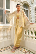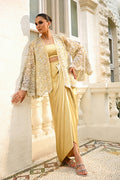 A luminous drape in molten butter yellow, this ensemble pairs a structured charmeuse bandeau with a pre draped skirt, sculpted in soft pleats for effortless movement. The sheer organza jacket, cut in a relaxed silhouette, shimmers with silver and tonal resham florals, zardoze accents, and scalloped edges. Flared sleeves with scalloped hems add a note of dramatic grace, completing the look with radiant poise.