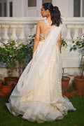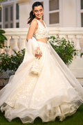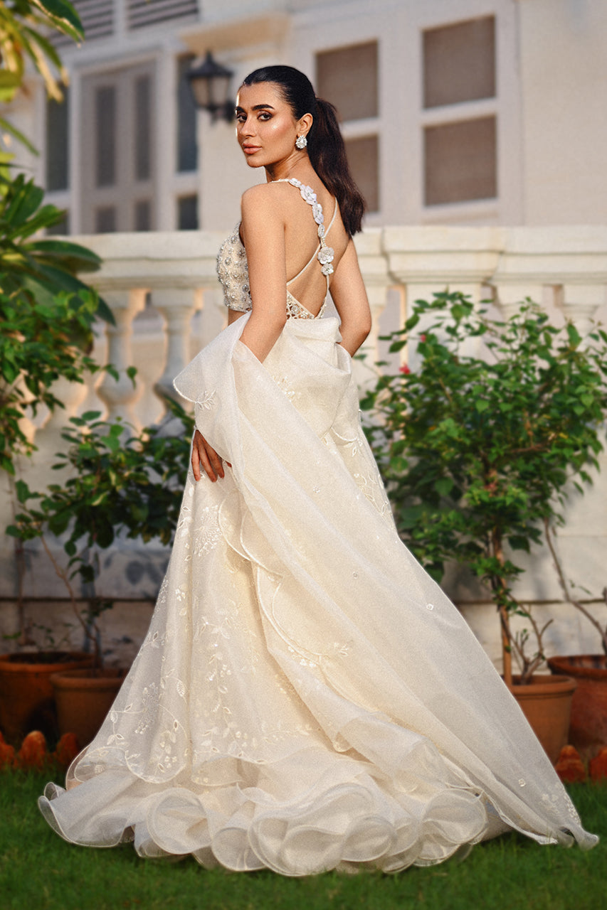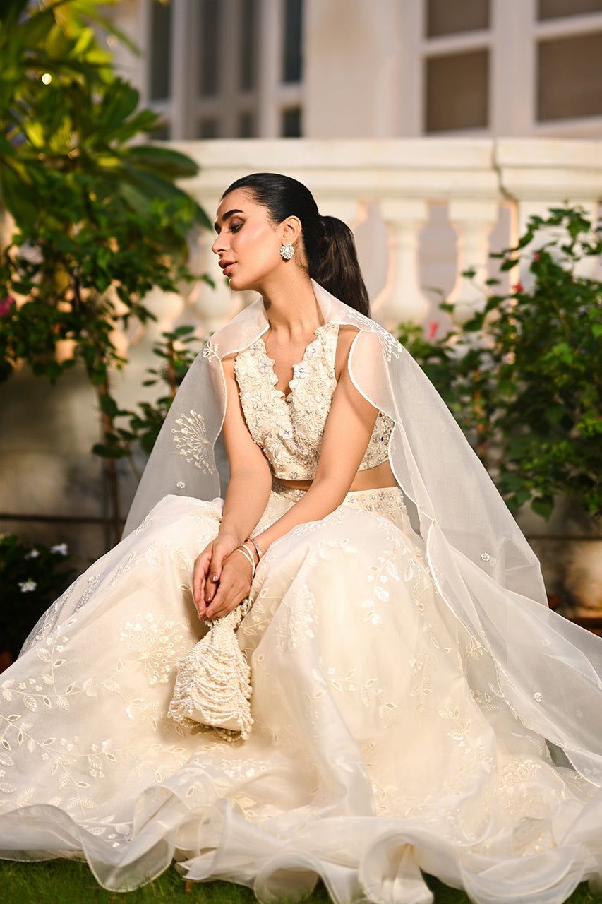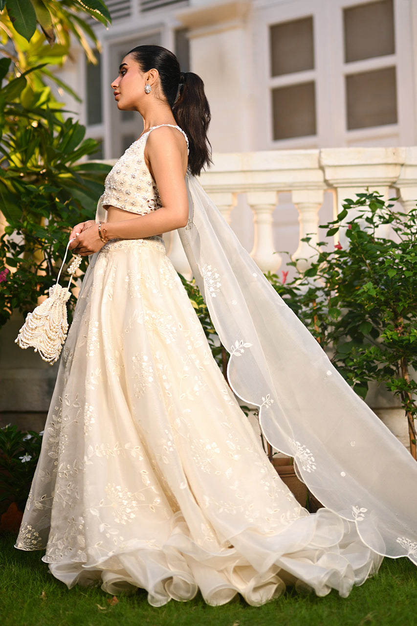 An ethereal lehnga set in moonlit ivory organza, delicately hand embroidered with tonal florals and sequins. The cropped choli, cut in a sleeveless V-neck silhouette, is adorned with resham and beadwork in intricate detail. Paired with a voluminous organza lehnga layered in sheer panels and embroidered with floral eyelet motifs, its ruffled hemline adds graceful depth. A diaphanous dupatta, softened with embroidered florals and scalloped edges, completes the ensemble with poetic finesse.